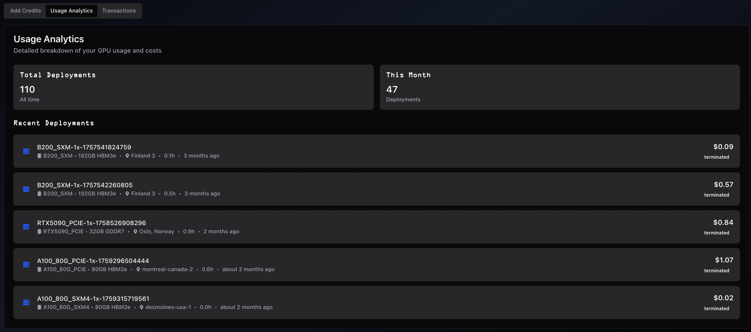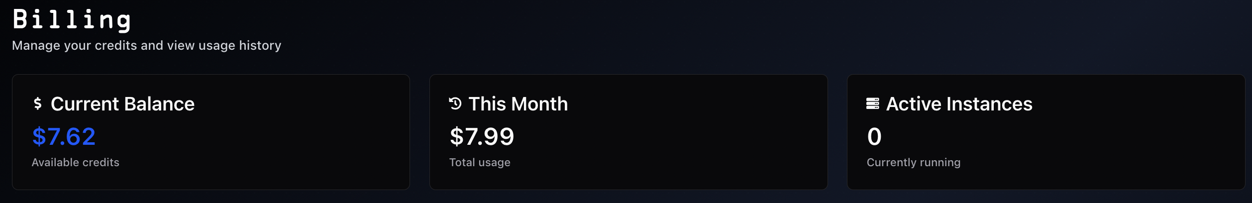 - Pay-per-second billing: credits are deducted continuously based on your hourly rate, so you pay only for the exact time your instance runs